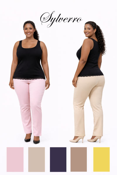 Pohodlné strečové nohavice s do dola sa zužujúcim spodkom a zvýšeným pásom. Postavu tvarujúci materiál pekne formuje krivky tela. Nohavice sú pri vreckovej časti ozdobené štrasovými nitmi. Vďaka pásu na gumičku sú veľmi pohodlné na nosenie no napriek tomu vyžarujú mladistvý nádych. Dostupné vo viacerých farbách.