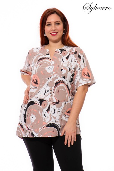 Jej pastelové farby navodzujú pravú jarnú a letnú atmosféru, materiál je príjemný, elastický a má jemný strih. Predĺžená blúzka po bokoch so zástrihmi a krátkym rukávom. V oblasti dekoltu s "V" výstrihom, hore na prednej strane ju zdobia módne chlopne.