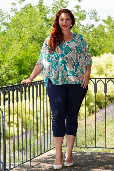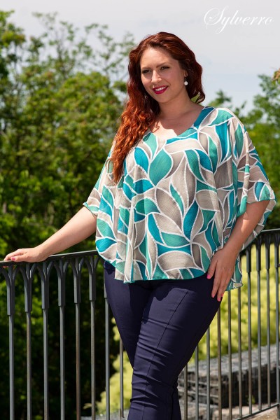 Vzdušná a ľahká spoločenská blúzka s prídavkom spoločenského čara, ktoré jej dodáva mušelínový materiál. Základ blúzky tvorý bezrukávový, elastický top, ku ktorému je do oblasti okolo krku našitý mušelín. Pekný výstrih predlžuje postavu a vytvára pekný dekolt. Oblý tvar mušelínu zase kryje tam, kde treba. Zaujímavý kúsok, ktorý je obľúbený aj u našich zákazníčok.
