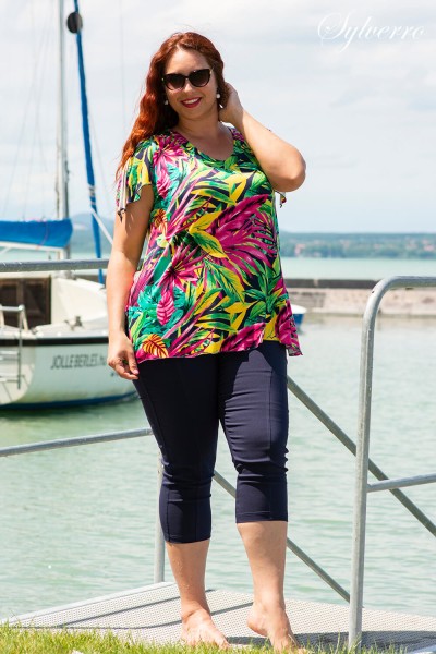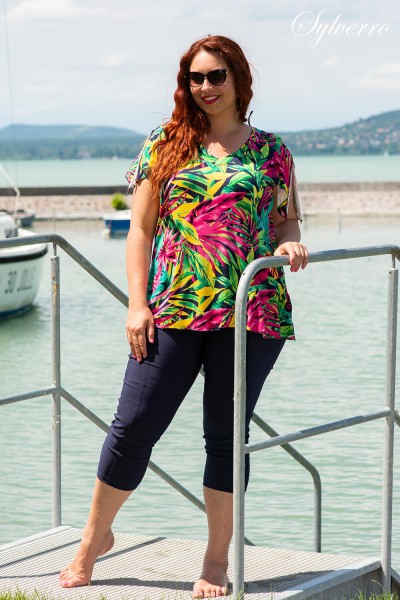 Príjemný, mäkko padnúci top z viskózy, ktorý sa vám v teple určite bude pohodlne nosiť. Má výstrih do „V“ vpredu, voľné volániky v spodnej časti a rozparky po bokoch. Rukáv zakrýva ruku a necháva rameno voľné.
