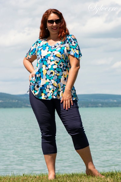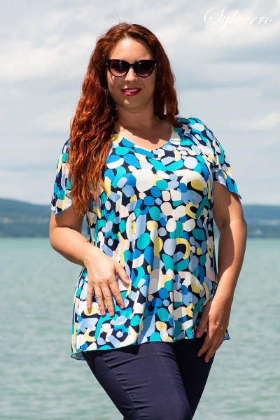 Príjemný, mäkko padnúci top z viskózy, ktorý sa vám v teple určite bude pohodlne nosiť. Má výstrih do „V“ vpredu, voľné volániky v spodnej časti a rozparky po bokoch. Rukáv zakrýva ruku a necháva rameno voľné.