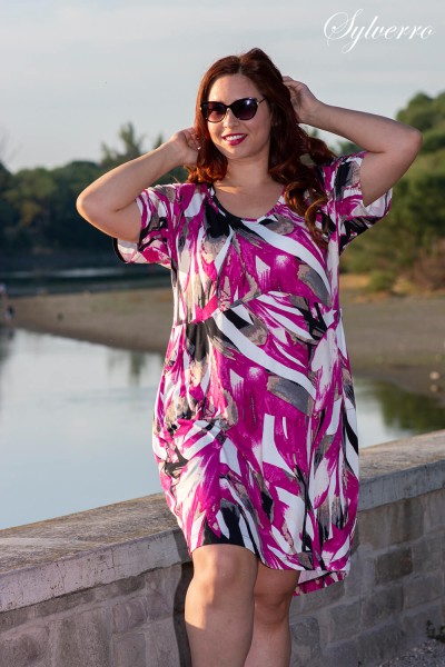Pohodlné letné šaty z prírodnej viskózy, tenké, voľné, pod kolená, módneho strihu, so zníženými ramenami a vreckami. Má pekný výstrih do písmena „V“ a strih nad pásom. Šaty s rozšíreným pásom a šikmým lemom. Veľkosti Malá (L, XL), Stredná (2, 3XL), Veľká (4-5XL).