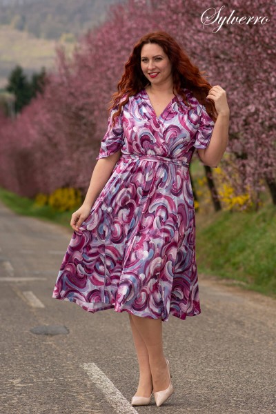 Pekné elegantné šaty po kolená s otvorom na ľavej strane, ktorý sa čiastočne stráca vo voľnej sukni. Prekrývajúci sa strih vrchného dielu dodáva ženský dekolt a módny vzhľad. Šaty majú elastický pás umiestnený pod prsiami. Pohodlné, elegantné a mladistvé šaty, ktoré sú ešte výraznejšie vďaka krásnemu materiálu.